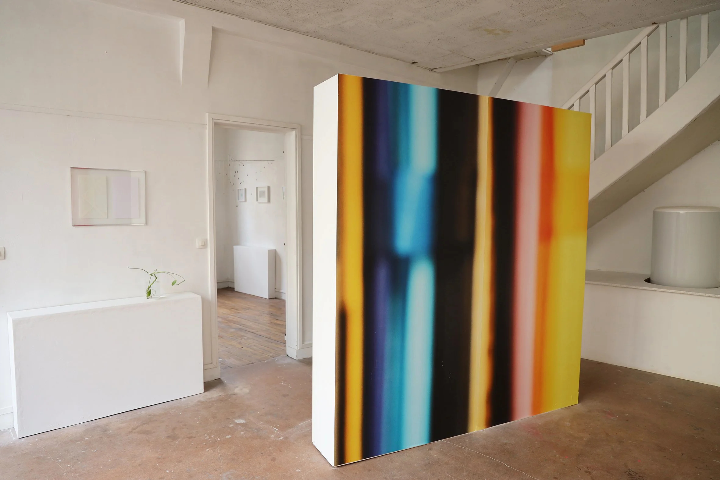 Nous rencontrons Lisa à l’atelier, tout juste rentrée d’une résidence d’un mois en Sicile. L’artiste appuie avec précision ses grandes peintures colorées au mur pour nous parler de son travail. Elle nous explique qu’elle aime voyager, découvrir de nouveaux paysages, qui se retrouvent dans ses peintures. Elle est déjà partie au Mexique, aux États-Unis… L’environnement qui l’entoure est central dans sa démarche. Dans ses peintures, le paysage devient corps, des formes abstraites émergent. Nous comprenons que les peintures varient en fonction de ce que l’endroit a transmis à Lisa ; elle retranscrit son essence, presque sacrée, et les sensations, la lumière et l’organique. Nous aimons le fait que le processus de transmission, tant dans ses émetteur.rice.s et récepteur.rice.s que dans sa forme, soit multiple. Qu’il ne puisse être qu’une impression, qu’un sentiment flottant.