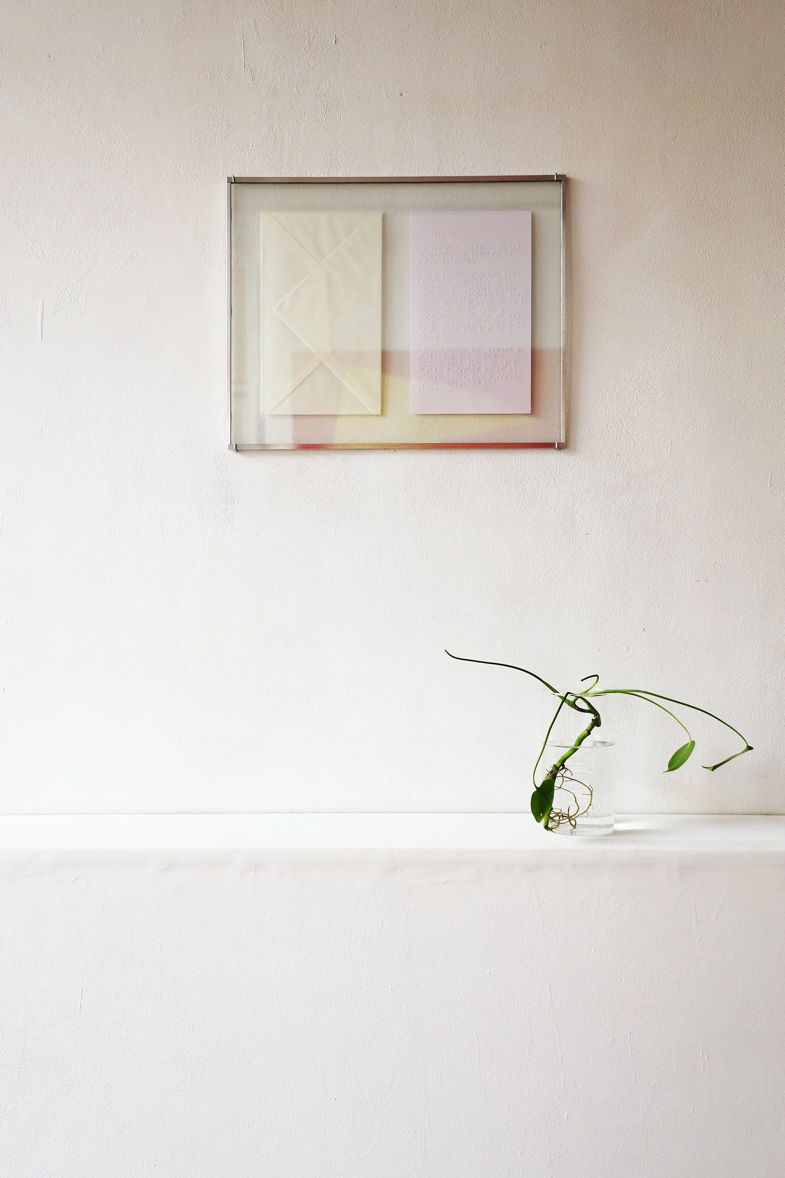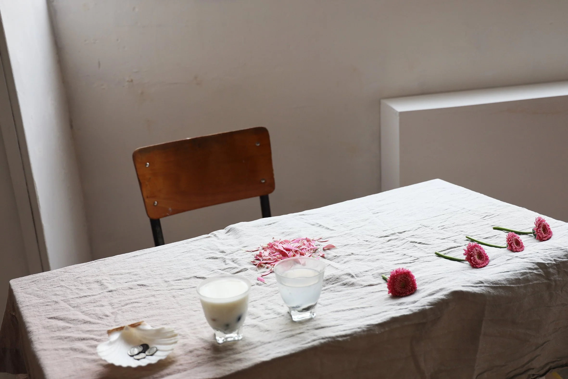 Après l’été, nous donnons rendez-vous à Maéva dans un café. Elle nous propose différentes façons de répondre à ce questionnement autour de la transmission. Alors que l’une de ses installations s’articulera autour du langage et de la communication impossible au travers d’un message figé ; une autre de ses pièces jouera entre matériau et signification, représentant l’idée d’une transmission mobile en perpétuel mouvement. Maéva souhaite également présenter une série de natures mortes réunies dans un bloc note aux feuilles détachables accompagné d’un tas de sable recueillis sur la plage. Cette pièce répond à un projet qu’elle a fait cet été autour de la correspondance et de l’échange. Elle aimerait que les visiteurs repartent de l’exposition avec un petit tas de sable afin qu’il continue son voyage.