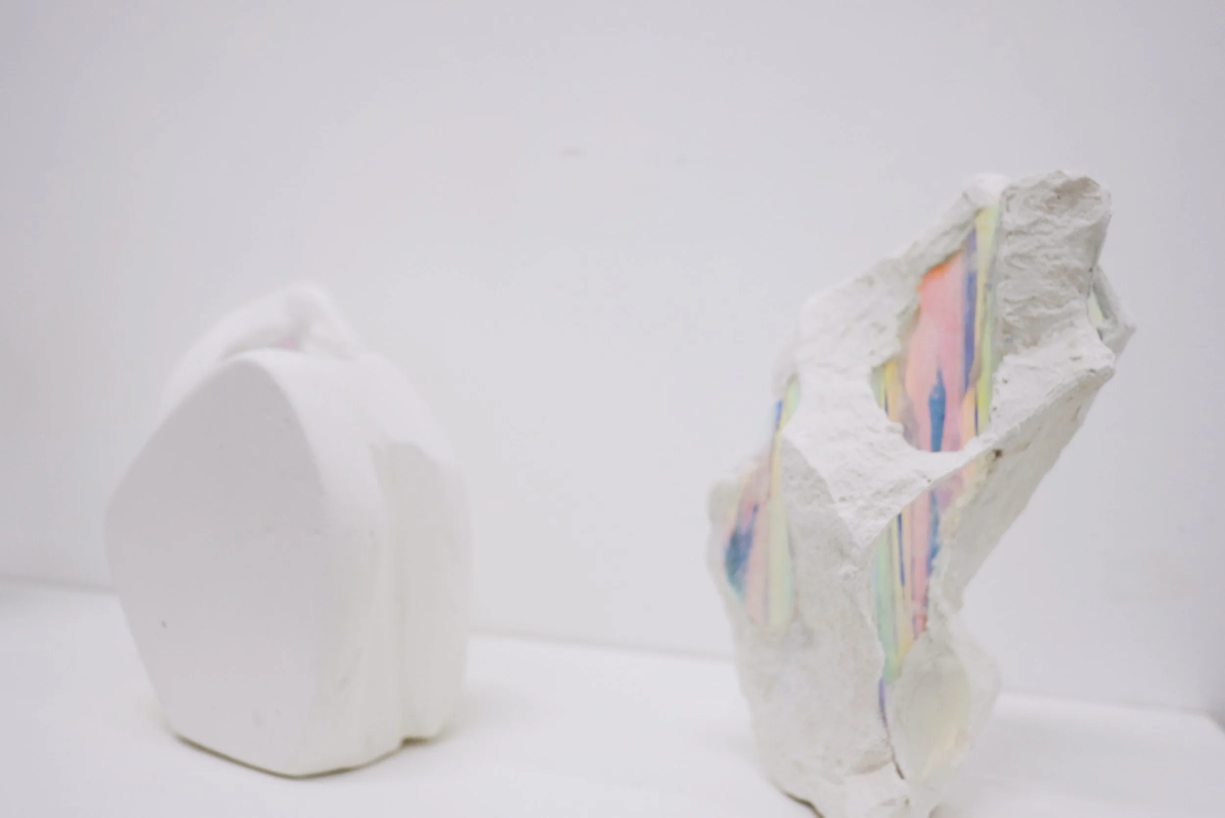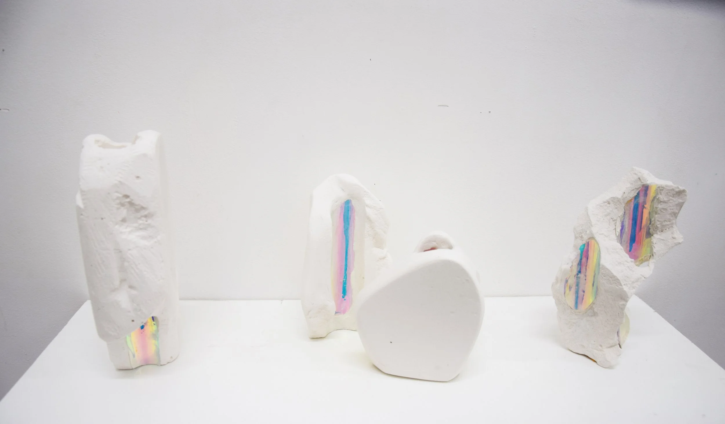 La brèche prolonge cette narration : conçu comme un espace intermédiaire, ce deuxième chapitre de l’exposition représente le lieu des métamorphoses, des transformations réversibles, d’une exploration du réel qui s’opère par la déconstruction de l’espace, l’hybridation des formes et le brouillage des frontières. Dans cet espace de l’entre-deux, les œuvres s’ouvrent progressivement à l’incertitude, à l’attribution de sens multiples. Des objets monolithiques, étranges et familiers, sont traversés par la lumière, les hologrammes d’un paysage végétal à la fois luxuriant et inquiétant brouillent nos points de repère, les silhouettes de corps en contraction luttent pour casser la géométrie étouffante de l’espace. L’intérieur et l’extérieur forment une surface unique et continue, tandis que des formes à la fois telluriques et organiques évoquent des paysages en métamorphose, ou les fragments de corps morcelés. Petit à petit, l’espace se dilate et se déforme ; les visiteur·euse·s l’aperçoivent sous un aspect différent à chaque rencontre avec les œuvres.